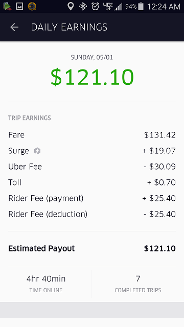 Uber has become more efficient with airport dispatches. Being able to generate $150+ in fare and surge in the slow season on a Sunday when only one or two cruise ships departed is pretty outstanding. $121.10 net in just 4hours40min – 7 trips.