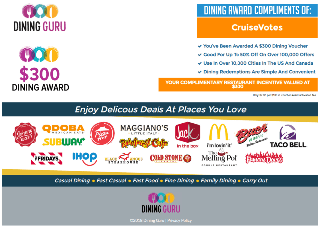 *You will receive a separate email courtesy of Cruise Votes with an “Activate Now” option to redeem your $300 Dining Award from Cruise Votes courtesy of Dining Guru. It should arrive shortly after you receive your Vacation Claim Email with Activation Code. We hope that you enjoy saving up to 50% on your dining experience at your favorite restaurants! As with almost all credible restaurant incentives, there is a small and nominal $7.95 activation fee for every $100 in dining award voucher! Activate your Voucher, then set up with the Location with your own ZIP CODE and start picking and choosing which Dining Offers to claim and activate. A typical offer may appear as “Save $25 off your bill above $75” with a $2 fee to redeem.