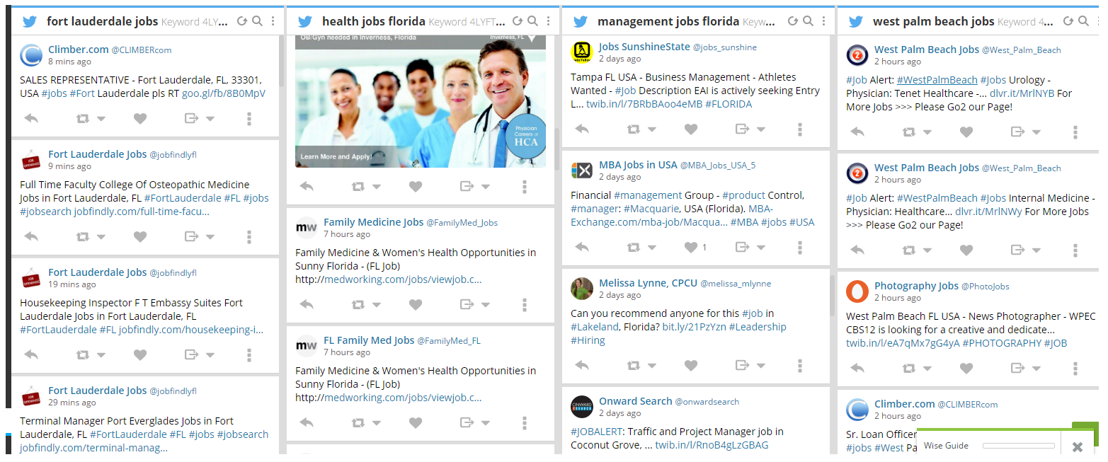 Witness for yourself the power of Twitter with this screenshot (click to enlarge) of multiple Job Feeds scrolling with new job postings (almost like the data feed from the movie, “The Matrix”). This is the future of job placement – live job postings streaming in real time that never get advertised in the newspaper!