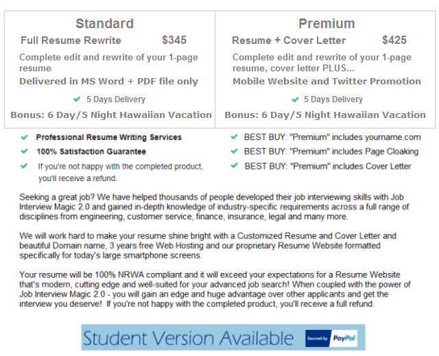 Place your order today for the Premium Organic Resume Package and you’ll receive your 6 Day / 5 Night Hawaii Vacation Voucher (you’ll will be able to manage every aspect of your Complimentary Vacation with just your name, email address and Certificate Number on the RedeemVacations website), a courtesy $50 Airline Gift Card and a free copy of Fodor’s Travel Guide – Big Island of Hawaii so that you can start your Dream Adventure. I was reading this guide for one month before I got on the plane to Phoenix then to Kona. I want you to have it for FREE with your Premium Organic Resume. It’s my gift to you – Wade.