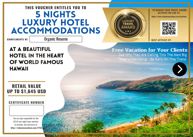 You will be able to ACTIVATE the Voucher immediately and make plans for your Hawaii Vacation while we start to work on your resume! When you order your Organic Resume, you will receive your 6 Day/5 Night Hawaiian Vacation Redemption Email within 24 hours of placing your resume order.